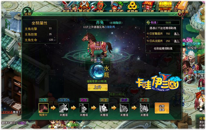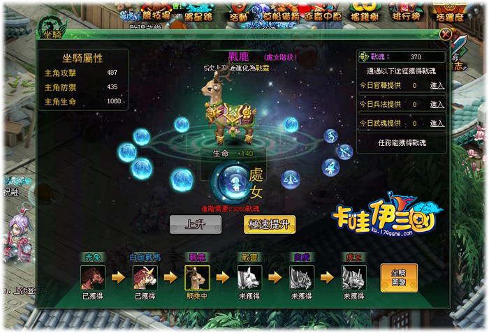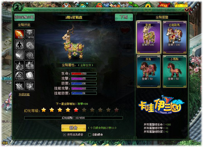 幻化坐騎後,玩家還可通過餵食坐騎不斷提升坐騎星級及品階,為主角或全隊加強屬性。玩家餵食坐騎為星星提升經驗值,經驗值滿即可升星,星滿即可升階。每次升級星星都將為坐騎帶來屬性提升,升階還可習得額外技能。玩家每天有多次免費餵食的機會哦,更可通過神秘商店及其他途徑得到高級餵食卡,獲得額外餵食機會。