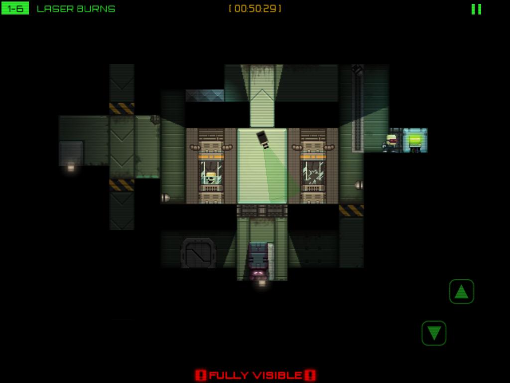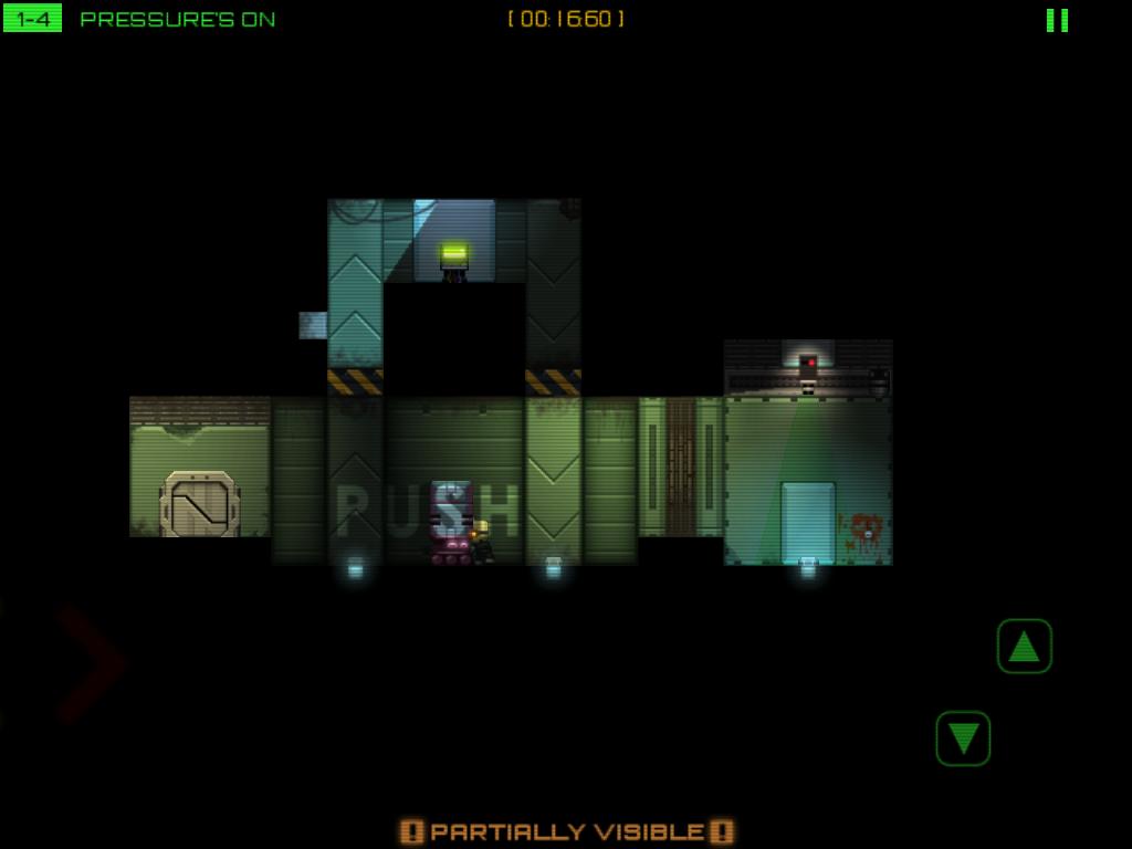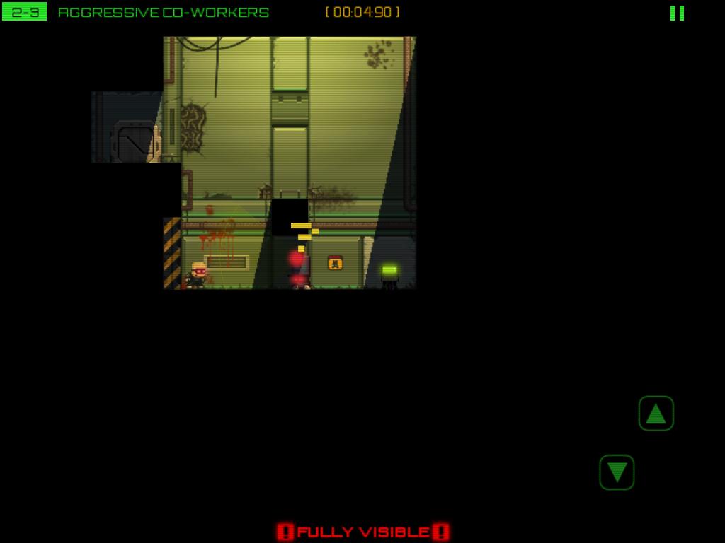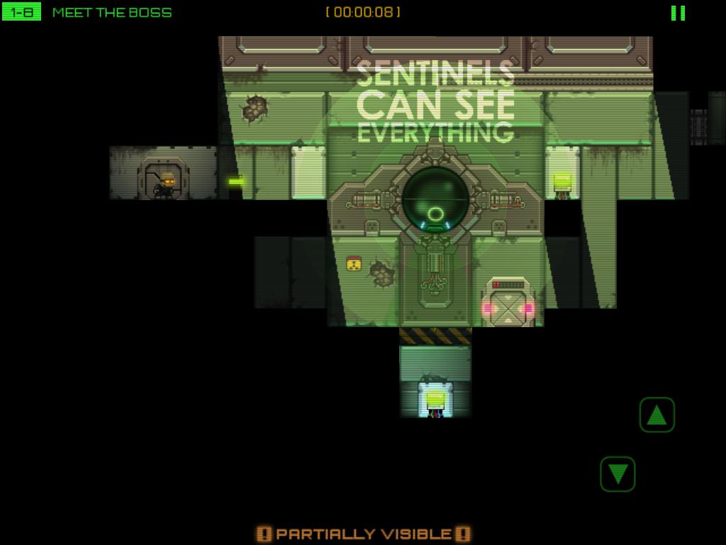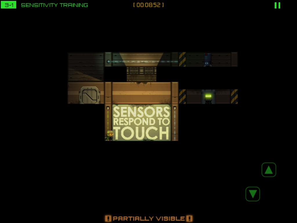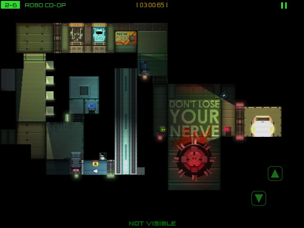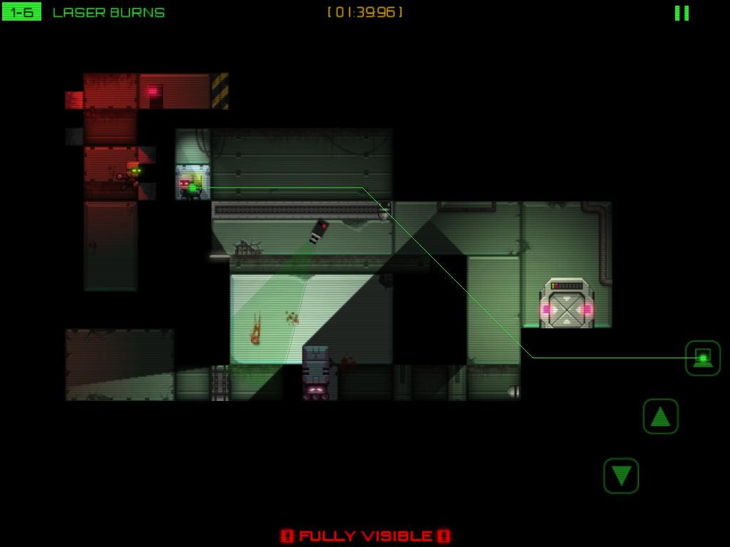 Stealth Inc》的動作指令只有三個,分別是趴下、跳躍和駭客,在畫面左半邊左右滑動手指就能移動角色。每一關玩家們的目標就只有駭入出口的終端機,打開出口大門並且平安抵達出口。