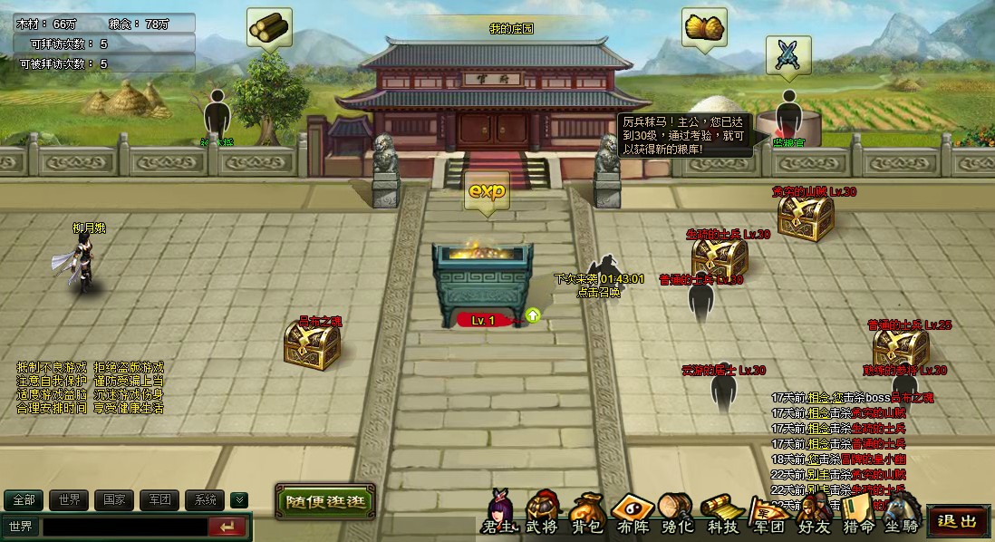 玩家擊敗廣宗之戰的Boss張角完成相關任務後,將開啟個人莊園。莊園可以透過香爐獲得個人經驗、經由種樹、糧倉產出木材、糧食等材料,最好玩的是可以與好友一同剿匪,有機會獲得神秘獎勵-呂布之魂。