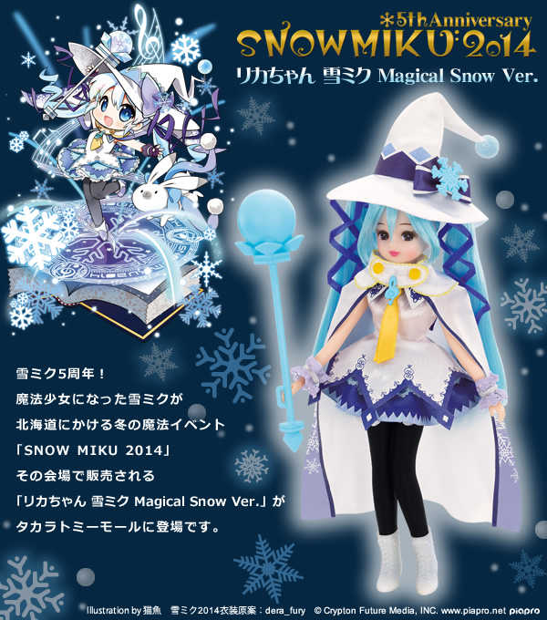 莉卡娃娃是由日本玩具廠商 TAKARA TOMY 於 1967 推出的女性向人偶。今年 7 月與初音未來推出第一波合作企劃獲得好評後,這次與 2014 雪初音造型結合推出了「莉卡娃娃 雪初音 Magical Snow Ver.」。