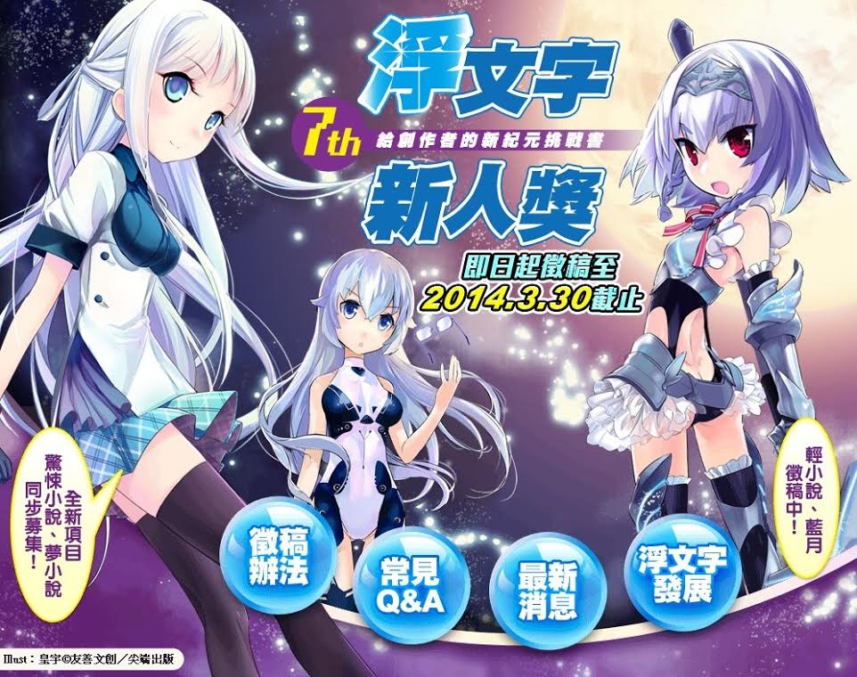 最新第七屆浮文字新人獎比賽,即日起開始徵稿至2014年3月30日!第七屆比賽擴大以往的規模,除了原本的「輕小說」與「BL小說」外,新增加「驚悚小說」與「夢小說」兩個類別,總獎金提升近百萬、強力催生下一位熱門作家!