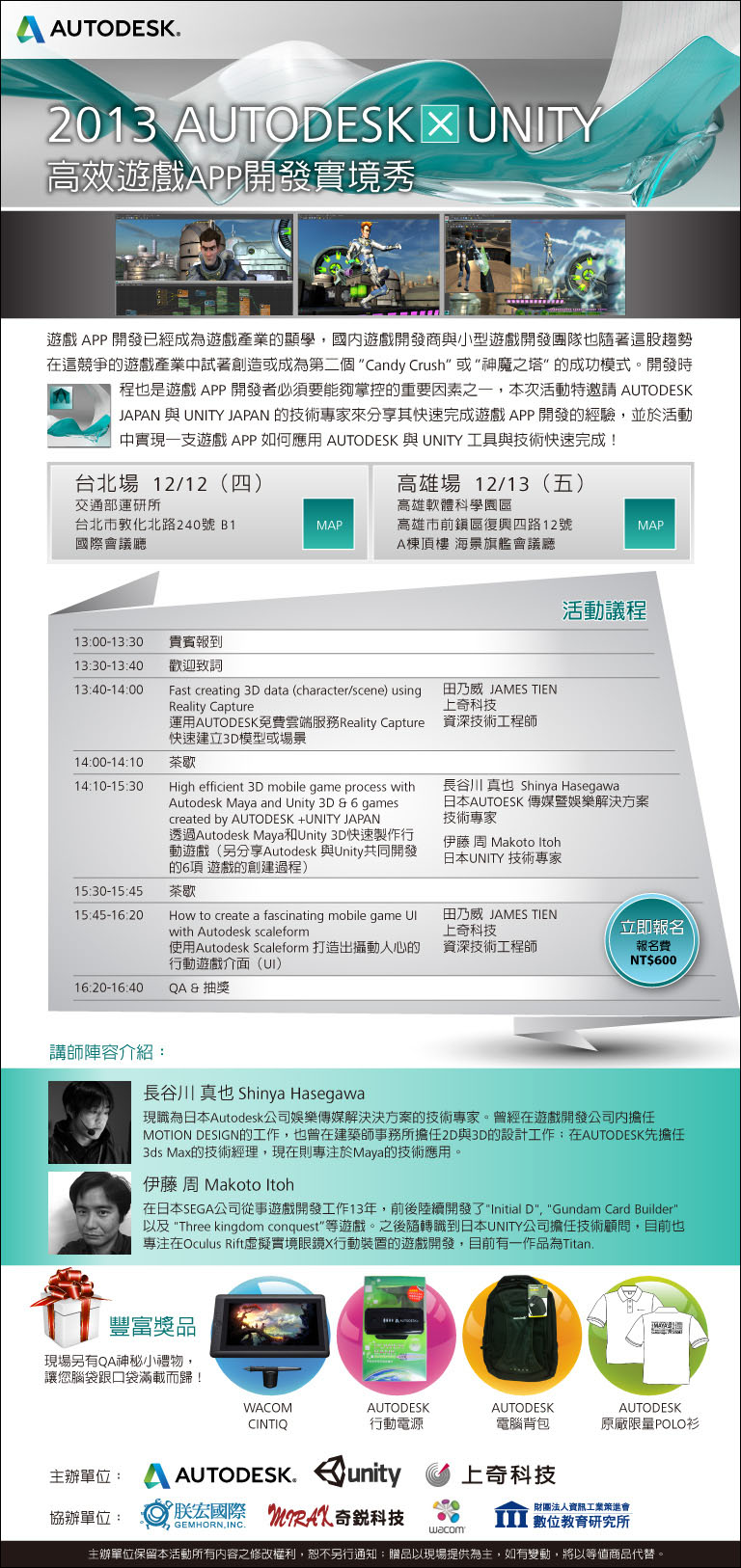 接著 12 月 12 日在臺北、12 月 13 日在高雄舉辦「2013 Autodesk X Unity 高效遊戲 App 開發實境秀」,邀請日本 Autodesk 傳媒暨娛樂解決方案技術專家長谷川真也和日本 Unity 技術顧問伊藤周分享其快速完成遊戲 App 開發的經驗,現場進行實作示範輕鬆快速完成一支遊戲 App,協助臺灣遊戲開發商強化手機遊戲的開發實力。