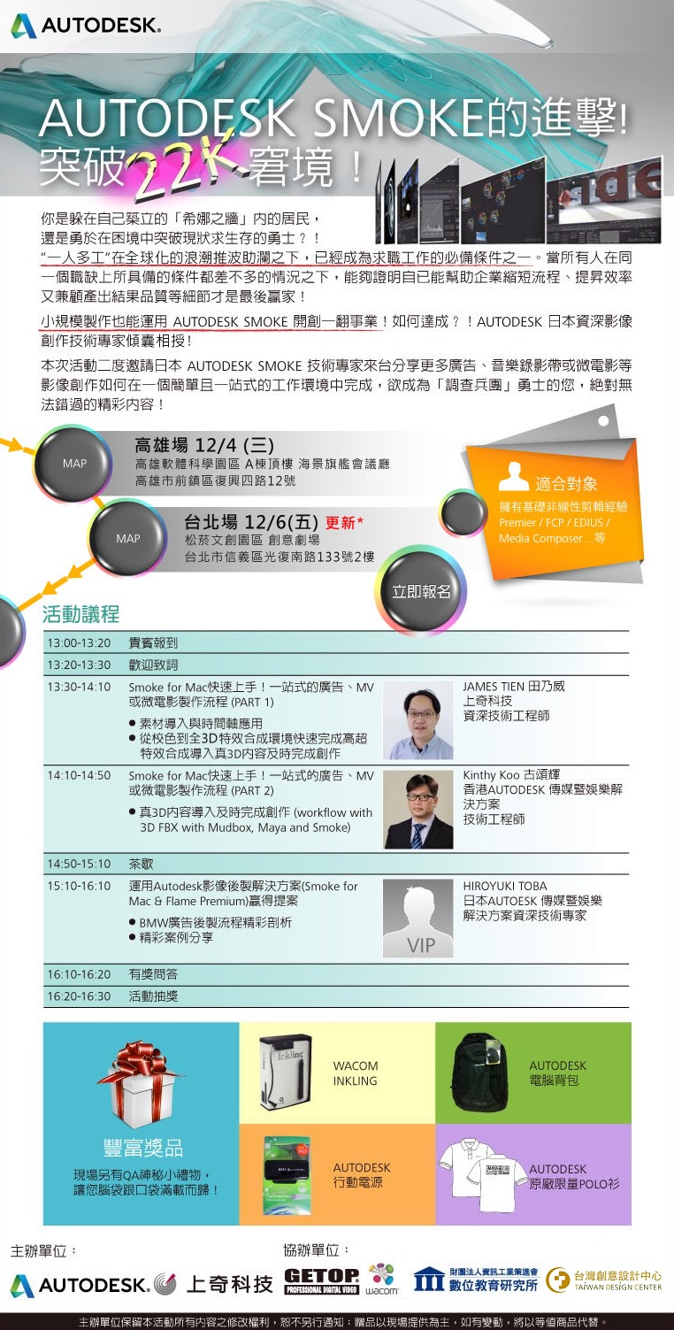 首先邀請日本 Autodesk 傳媒暨娛樂解決方案資深技術專家 Hiroyuki Toba 來臺傳授經驗,12 月 4 日在高雄、12 月 6 日在於臺北與使用者面對面會談,分享廣告、音樂錄影帶或微電影等影像創作如何在 Autodesk Smoke 簡單一站式工作環境中完成,讓小規模製作也能開創一番事業。