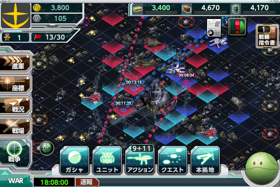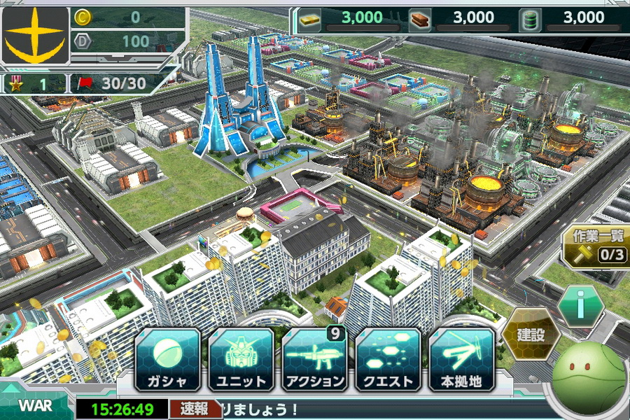 王國征服》才實現出的全新型態鋼彈遊戲,玩家必須在據點建造住居以及資源工廠等來強化軍事力,創造屬於自己的最強部隊。