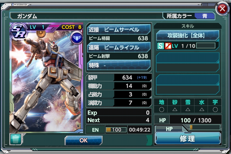 遊戲武裝是特化近距離戰鬥的裝備,所以不太擅長遠距離攻擊,不過基本性能跟最高等級的鋼彈同等的緣故,在遊戲初期跟中盤是一架非常可靠的機體!
