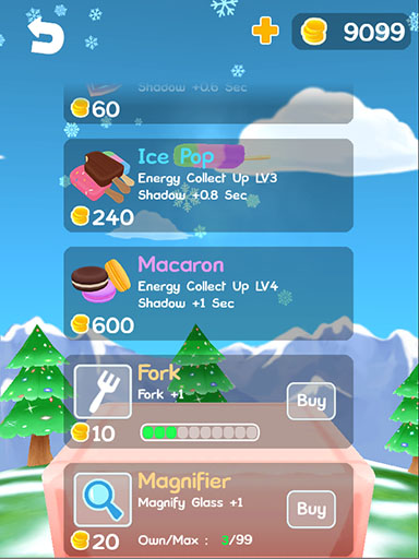 遊戲的關鍵功能:放大鏡與叉子,玩家可以用賺來的金錢來增加可使用的次數,每多一次,可都是保命與創紀錄的關鍵,可以讓喜愛的玩家體驗疊塔的最高境界。