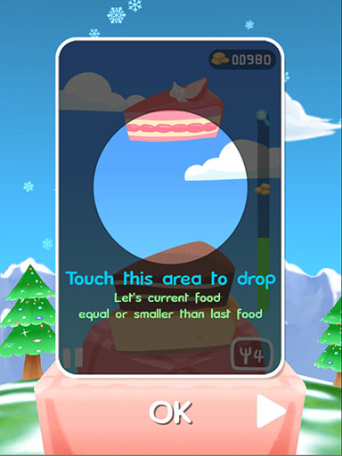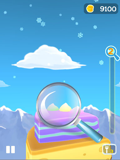 由於即將落下的甜點一直在變大變小,玩家必須掌握精準的時機點,按下畫面就可以立即讓甜點落下來比大小,只要越接近而不超過底下甜點的大小,就算是成功堆疊。越是完美就可以累積到更多的放大鏡能量。