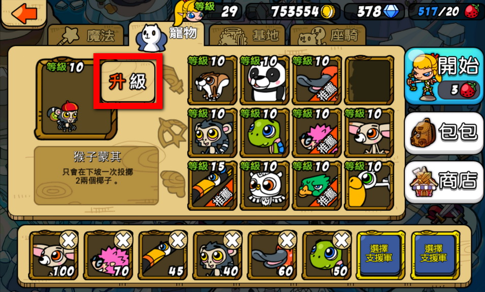 在「寵物」的頁面,總共有 12 種寵物將與玩家一起闖關打敗邪惡博士。當玩家要進行挑戰關卡時,必須要先清楚的知道每隻寵物的特性與適合的地形,而當關卡越來越困難時,也別忘了要提升寵物的等級,才能夠順利擊退敵人!