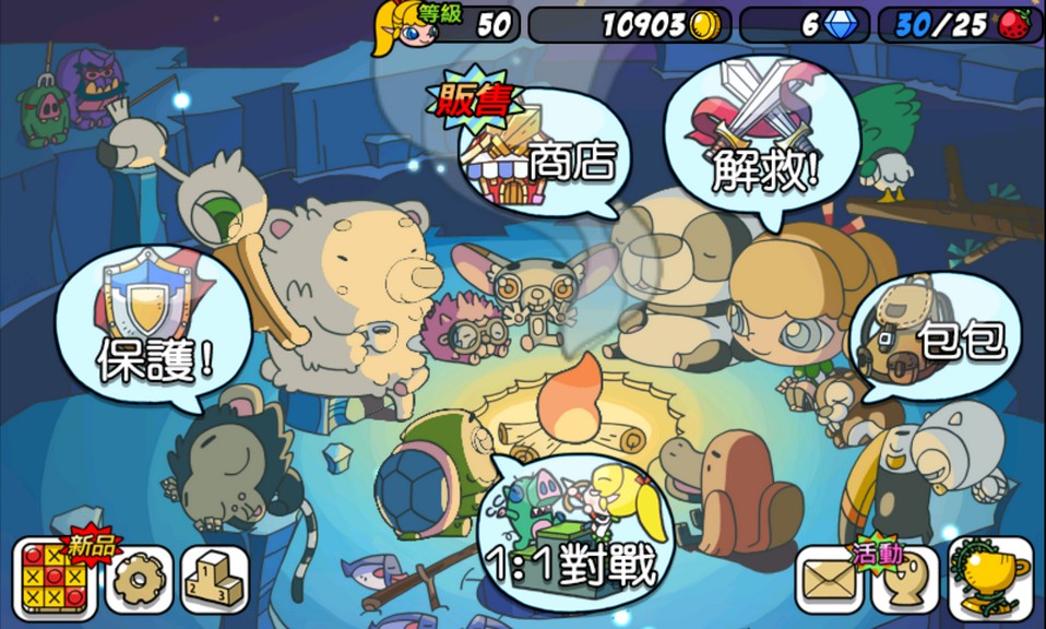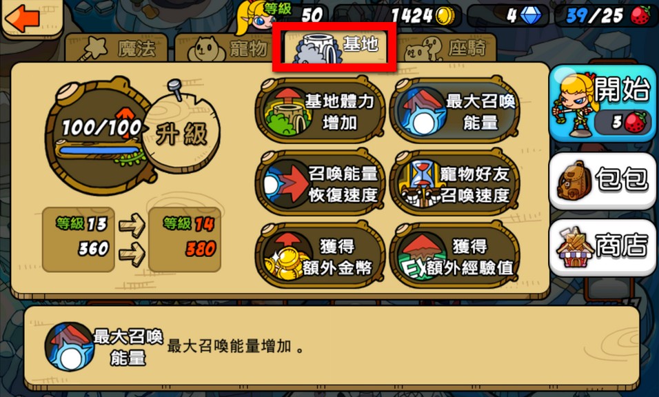 透過「基地」的頁面,玩家能夠在此提升我方基地的體力、召喚能量上限與能量恢復速度,當關卡越來越困難的同時,記得要提升基地的相關能力值,否則當部分寵物超過召喚上限或是冷卻速度過慢時,都很有可能瞬間被敵人給翻盤的!