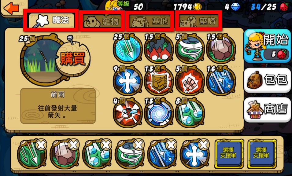首先,玩家會先看到「魔法」的頁面,在此要先挑選適合此關卡的魔法,每個地形所搭配的魔法皆不同,若是使用正確的魔法,在擊退敵人時便可事半功倍。