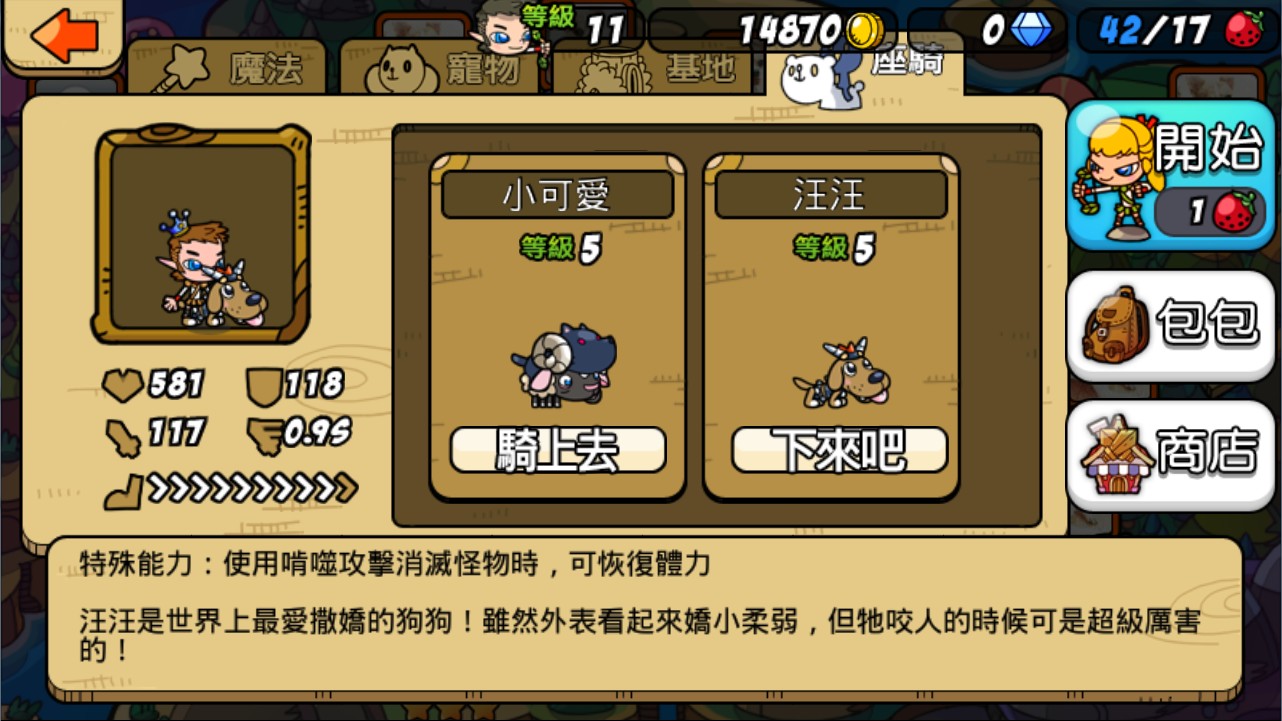 系統在最開始會贈送玩家一隻最基本的座騎「小可愛」,若是想要提升座騎的能力,就必須在闖關時騎乘牠。此外,遊戲中也擁有非常多的座騎類型,每當玩家獲得新的座騎,便可在「座騎」的頁面檢視或更換。