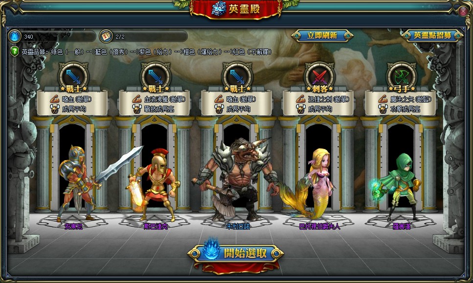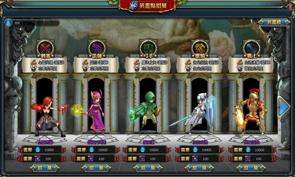 在遊戲內,玩家可以在各城鎮裡尋找 NPC「祭師」和「主教」,透過他們對諸神的信仰就可以進入英靈殿中招募傭兵。在英靈殿中會隨機出現各種職業的傭兵應有盡有,傭兵能力視其顏色區分,含白色、綠色、紫色、橙色及傳說中的紅色傭兵,每一個傭兵都可以看到他的職業、技能及能力成長方向。玩家可以清楚的依照這些資訊來招募,搭配出屬於自己最強的隊伍。