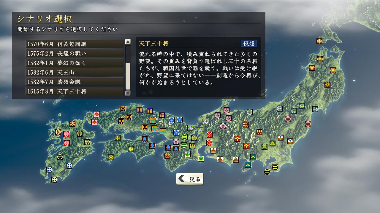 ・追加劇本:『天下三十將』 這是 30 個不同的勢力同時爭奪天下、希望統一日本的假想劇本。 概略:在時間的洪流中,有著許多逐漸堆積起來的野望。 被這些野望支配,背負著它們誕生的三十位名將,將在這個戰國亂世爭奪天下。 繼承了的戰爭,無法完成的野望—— 創造只是個開始,現在似乎又有什麼正要展開。