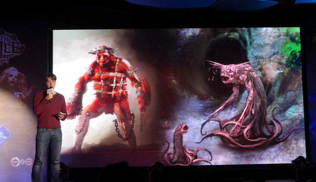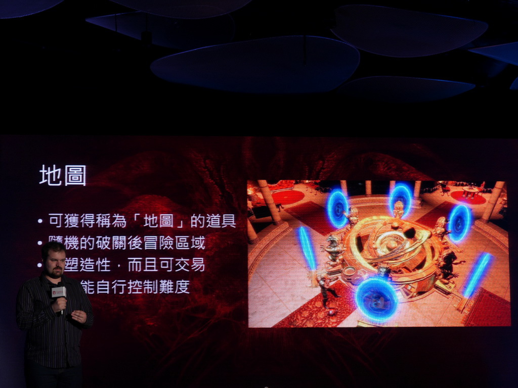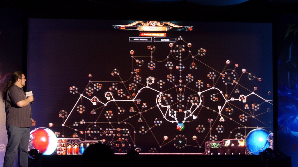 Jonathan Rogers 現場介紹了結合技能樹、寶石系統與裝備道具,讓玩家可以打造屬於自己特色的角色。在《Path of Exile》每個角色都有不同的核心屬性,玩家透過紅色(力量)、綠色(敏捷)、藍色(智力)不同的寶石,創造出屬於自己的技能組合。他們花了很多時間打造這個結合 1400 種技能的「技能樹系統」,此系統能夠增加角色職業技能的效果及威力,玩家必須透過升級取得點數,而如何利用有限的點數,在這麼多技能中進行配點,則是每一個玩家打造獨一無二玩法的訣竅,像巫師可以選擇施法的攻擊力與施法速度等。他相信藉由這三樣組合,台灣玩家未來將可能打造出連他們原廠都想像不到的角色特性。