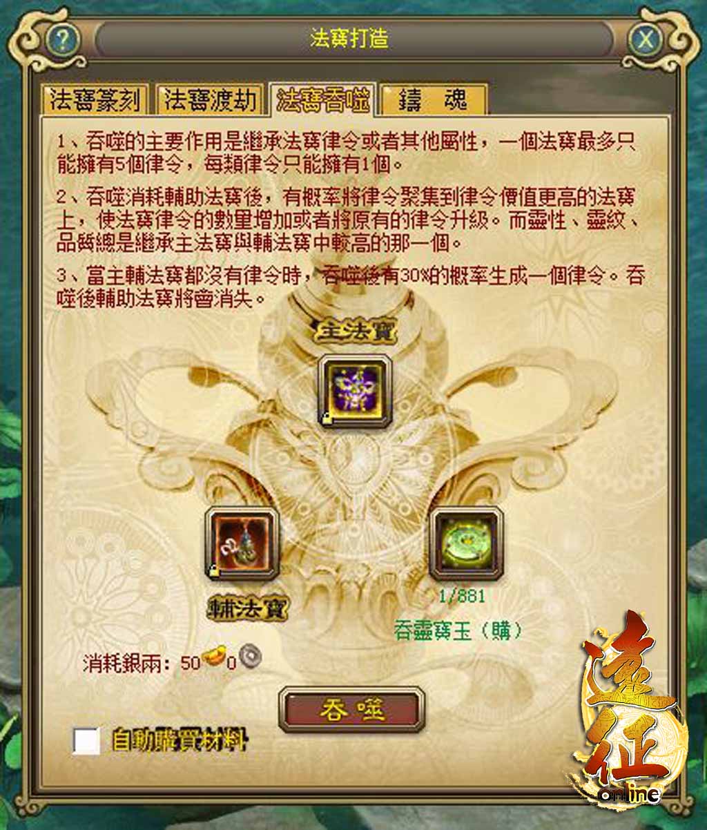 【法寶吞噬】:律令是法寶觸發技能的基礎屬性,律令的獲得除了自然產出外,更重要的就是吞噬。法寶的吞噬,有一定的機率生成新的律令(需使用與自身法寶不同律令),或升級原有的律令(需使用與自身法寶相同律令)。其它的屬性都會繼承主或輔法寶中最高的那個。法寶吞噬還需要消耗吞靈寶玉,吞靈寶玉除了通過領地獲得(暫未開放),也可以於商城中購買。