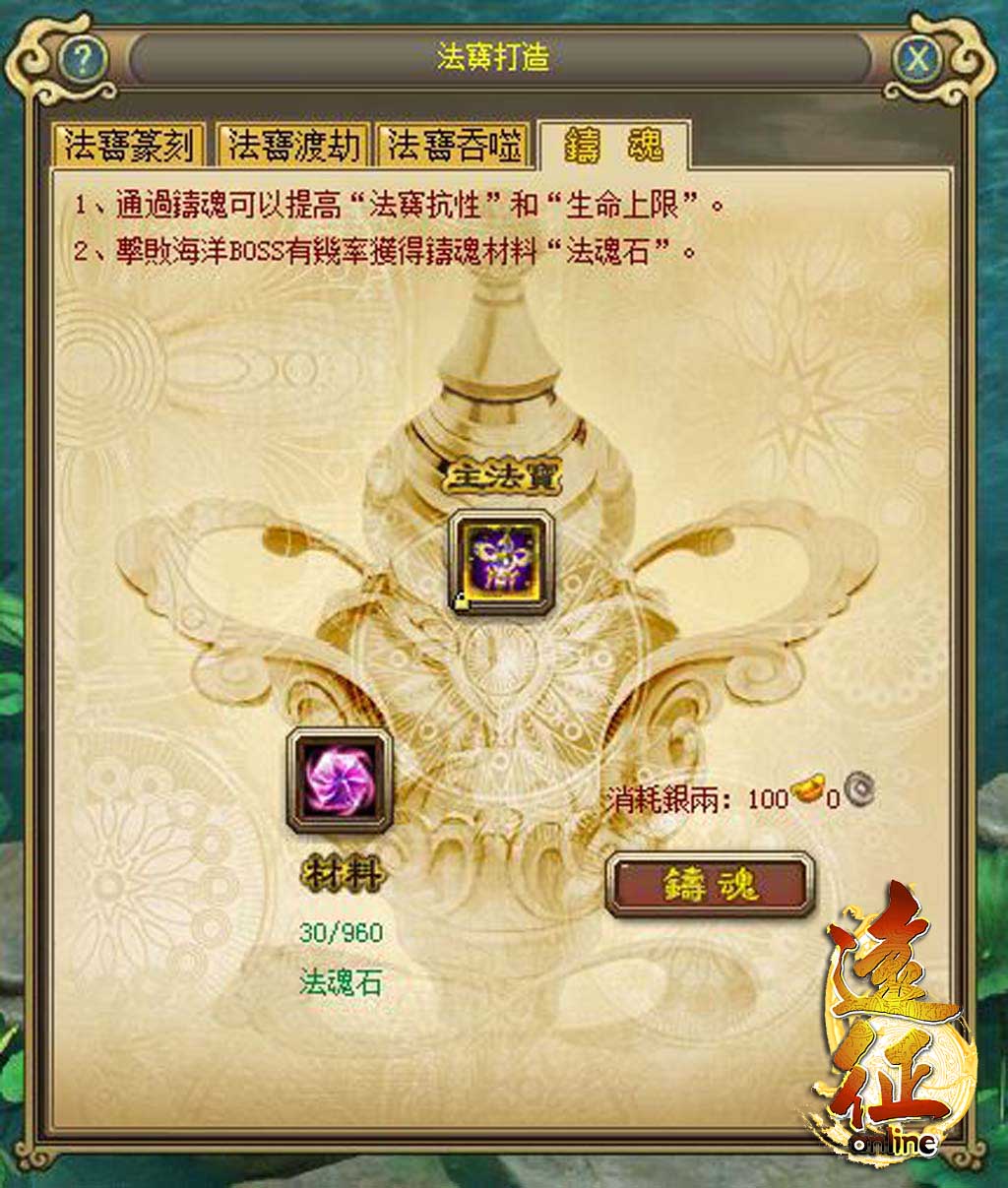 【鑄魂】:法寶的鑄魂主要是提升生命上限和法寶的抗性,而鑄魂需要的法魂石,必須透過擊敗海洋BOSS來獲得。