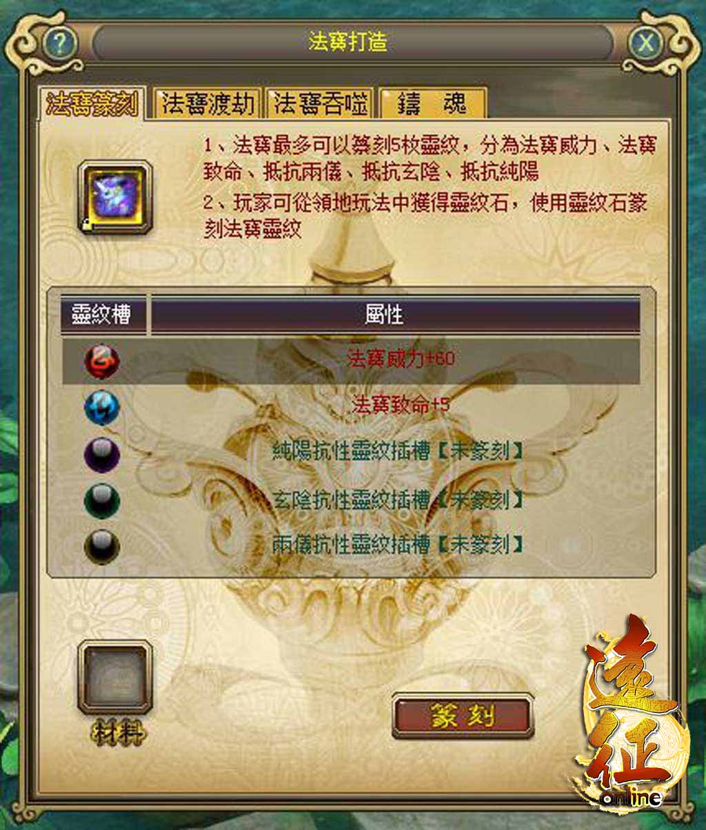 法寶篆刻就是篆刻法寶的靈紋,靈紋分為威力、致命以及三種屬性的抵抗共五種方向,靈紋石可提升法寶的基礎屬性