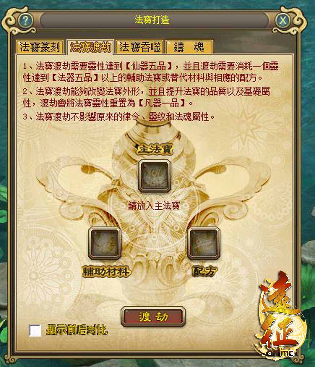 【法寶渡劫】:法寶的靈性達到仙器五品之後,可以藉由消耗另一個五品的輔助法寶和配方,讓法寶的品質上升一個檔次,這就是渡劫。法寶渡劫之後,造型和屬性都發生變化,但不會改變律令、靈紋和法魂的相關內容。