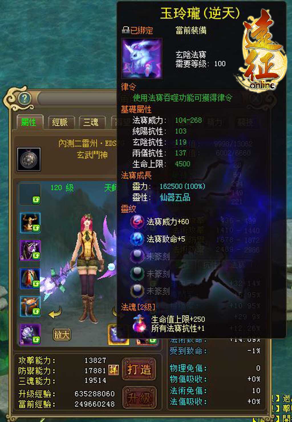 在新增加的「法寶系統」中,玩家可以經由法寶篆刻、法寶渡劫、法寶吞噬、鑄魂等方式增加法寶的威力、品質或是屬性。法寶的打造和翅膀類似,屬性共有三種,分別是:玄陰,純陽和兩儀,這是區別法寶攻擊屬性的唯一途徑。在靈紋的位置可以看到各種屬性的抗性,這個是唯一可以降低法寶攻擊的方式。法寶的各項數值越提升,打怪、吃王、擊殺也就越輕鬆喔!