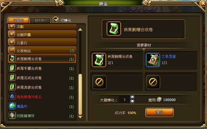 若是想要將道具轉換成「非綁定」的狀態並進行交易行為,可以到「鍊金」介面中,使用「交易憑證」便可將道具的綁定狀態解除。