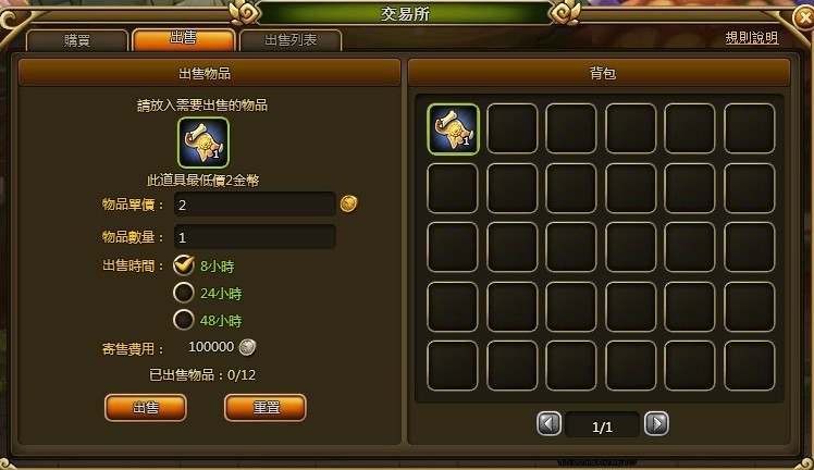 當物品成功解除綁定後,便可以在拍賣系統中販賣予其他玩家,在拍賣介面中,可以設定物品賣出金額與物品賣出數量;系統會依照所設定的拍賣時間以及設定的拍賣金額收取一定的寄售費用,最多可以同時拍賣十四項物品。