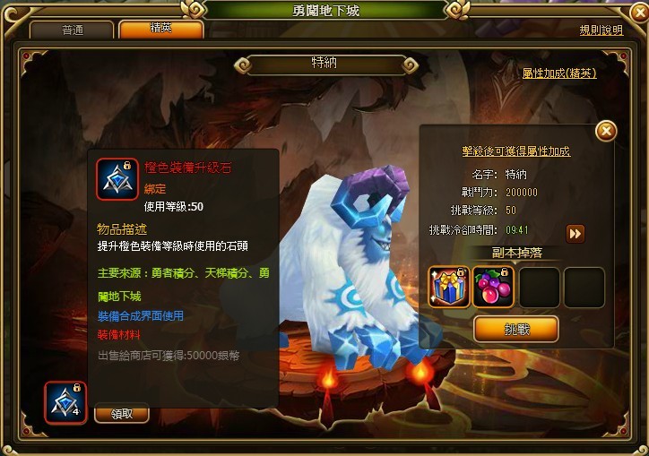 為了獎勵玩家對於全新副本「勇闖地下城」的積極挑戰,成功通關任一難度的關卡,都可以獲得品質優良的經驗果實,除此之外;「橙色裝備升級石」也是必掉落的副本獎勵。