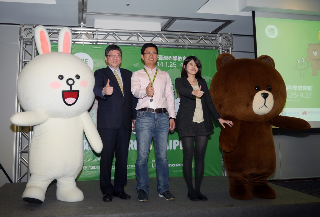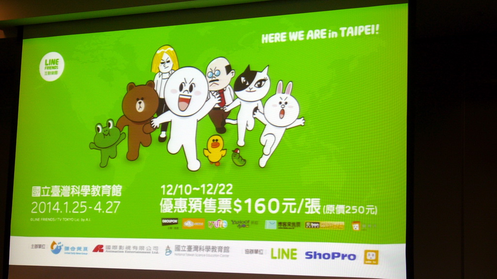 由聯合報系、國際影視共同主辦,LINE、ShoPro 協辦的「HERE WE ARE in Taipei-LINE FRIENDS 互動樂園」預定明年 1 月 25 日至 4 月 27 日在士林科學教育館登場。LINE 全球註冊用戶數突破 3 億人,全台用戶數則為 1700 萬人;LINE 台灣分公司副總經理陶韻智表示,LINE 在台灣用戶喜愛度、活躍度與佔有度很高,LINE 的角色在台很受歡迎,每次公司辦活動、LINE 公仔上街時都吸引民眾要求拍照,很高興聯合報系在台促成這個全球首次 LINE 的大型展覽誕生。