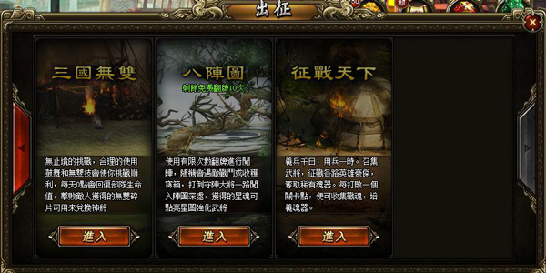 在「征戰天下」中,主公如果擊殺關口的守衛名將,即可得到豐厚的銀兩和珍稀的戰魂!而過關的主公,更可得到三國名馬等各種道具!豐厚的獎勵,就等主公來戰哦!