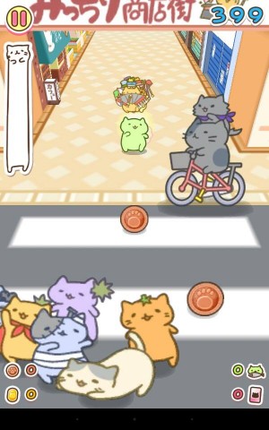 本作有許多可愛的貓咪會登場,相信都會讓許多貓奴開心收集!隨著遊戲的進行,雖然錢幣出現的頻率會加快,但遊戲的速度也會變得非常的快,此時除了閃避障礙物之外,還得閃避會讓遊戲瞬間結束的阻礙角色,例如獅子跟大貓滾球等,所以遊戲難度會變得相當困難,但玩家請不要灰心,重複遊玩賺取金幣來強化喜愛的貓咪吧!