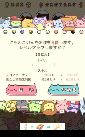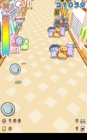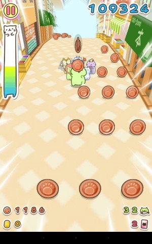 而遊戲中取得的錢幣跟金幣可用來購買新的貓咪、增加貓咪外觀顏色,以及讓貓咪升級,由於每隻貓咪都有不同的額外效果,所以玩家能夠挑選喜歡的顏色跟適合自己玩法的貓咪來進行遊戲。而路上偶而也會出現「貓咪卡」,所撿到的貓咪卡都可在貓咪房間的圖鑑中來確認。