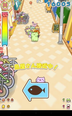 而遊戲另一個攻略重點就是魚店了,只要玩家帶著貓咪闖進魚店“掠奪”的話就能增加許多分數,如果能讓跟在後面的貓咪更多就能得更多分數,所以玩家要積極的撿箱子來增加貓咪數量並且闖入魚店。