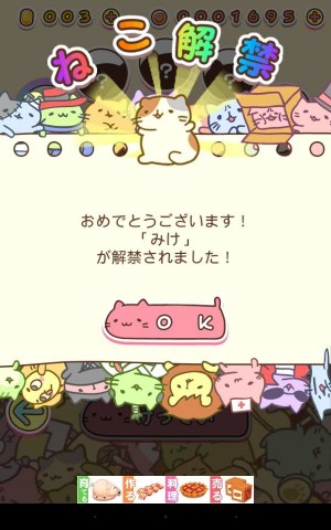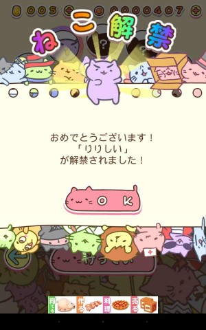 點擊標題畫面進入遊戲後會進入貓咪的家,在此可看到圖鑑(ずかん)、選擇貓咪(ねこ選択)跟設定的選項,而畫面下方有 3 種道具可讓遊戲中產生各種效果。