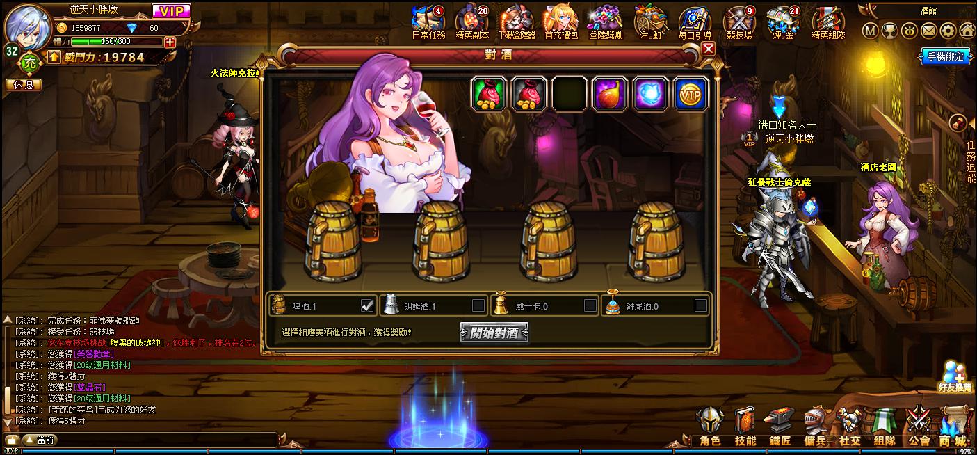 龍之紋章》酒館之中,佳釀無數,玩家可與老闆娘對酒,這是一個考眼力的小遊戲,老闆娘會把獎勵放到任意一個酒杯子裏面,隨後進行移動換位,玩家必須從中選出含有獎勵的酒杯,否則就會被罰酒。三杯不上崗,普通玩家每天有 3 次對酒的機會,VIP 玩家胸襟更為廣闊,可以有額外的次數。