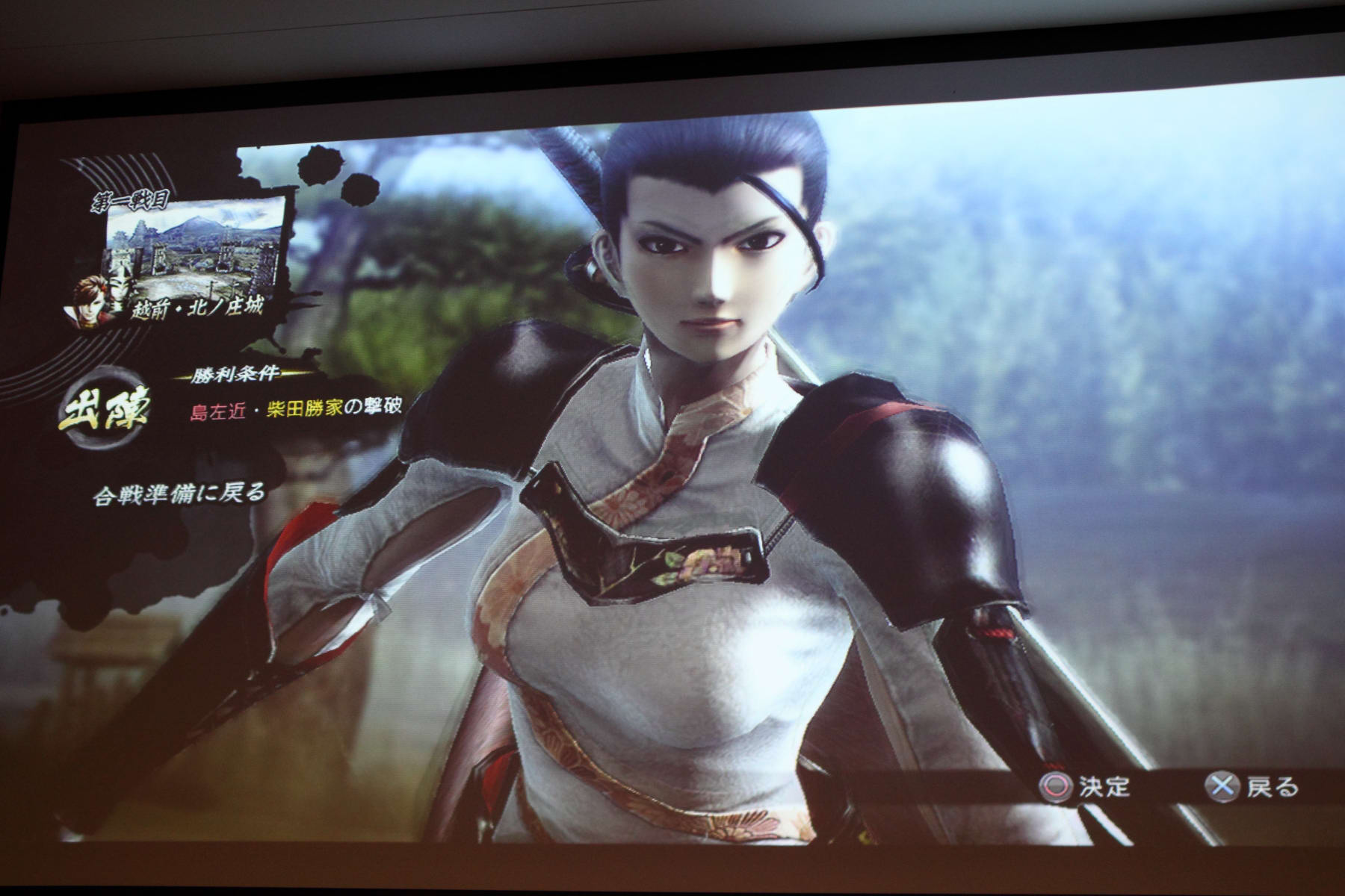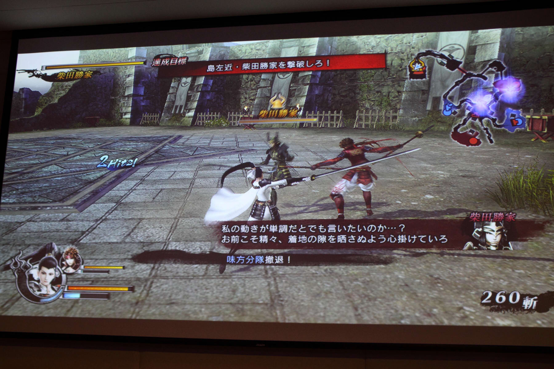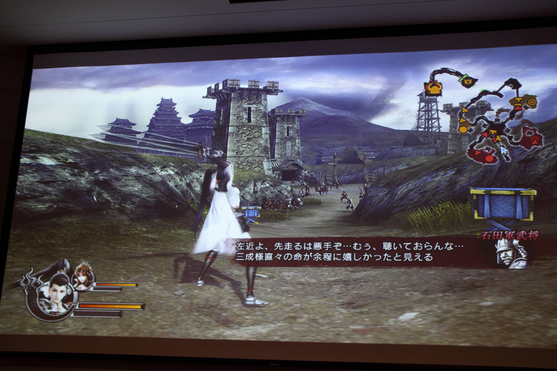 首先選擇了「島 左近」來遊玩和武田軍對陣的關卡。製作人表示在進入關卡之前可以看到武將會持續在地圖上騎馬移動,保持這個動態選擇關卡。同時,在進入關卡之後,製作人首先解釋島左近是一個動作靈活的角色,可以輸入 L1 來切換「雙刀」和「踢擊」兩種型態應戰。使用雙刀時攻擊範圍比較大,段數也比較多;切換到踢擊時攻擊威力則是比較高,連段也集中在面前的敵人之前。