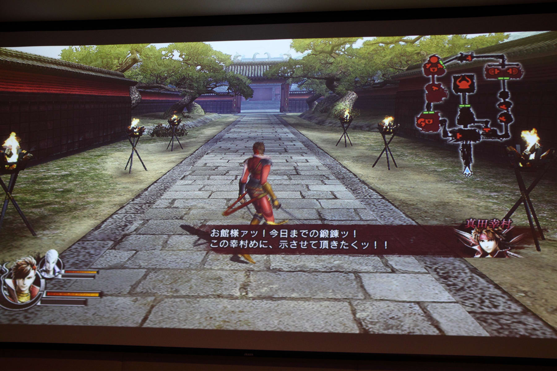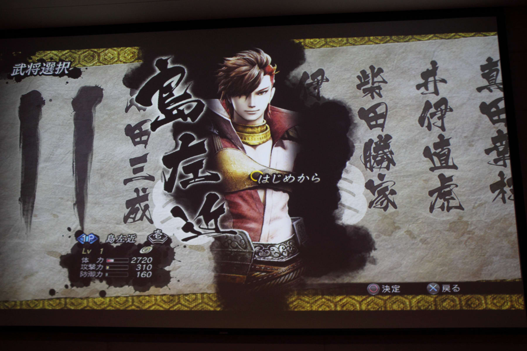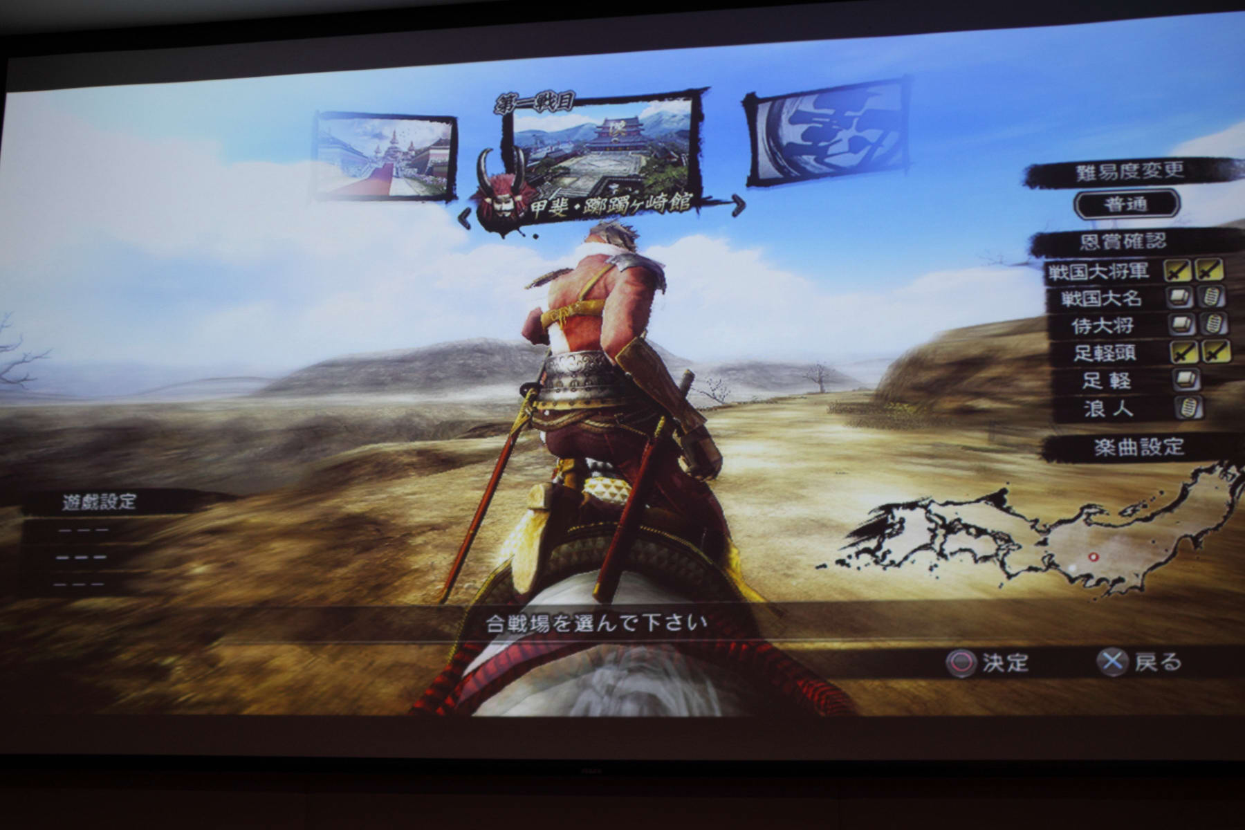 首先選擇了「島 左近」來遊玩和武田軍對陣的關卡。製作人表示在進入關卡之前可以看到武將會持續在地圖上騎馬移動,保持這個動態選擇關卡。同時,在進入關卡之後,製作人首先解釋島左近是一個動作靈活的角色,可以輸入 L1 來切換「雙刀」和「踢擊」兩種型態應戰。使用雙刀時攻擊範圍比較大,段數也比較多;切換到踢擊時攻擊威力則是比較高,連段也集中在面前的敵人之前。