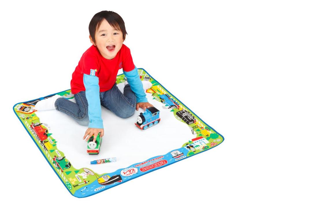 滿天星攤位現場免費開放湯瑪士水塗鴉組(圖左)、積木、小火車軌道等玩具試玩
