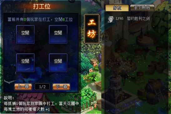 此外,家園中還設有工坊,可以抓補你的手下敗將前來為你打工,增加土地的種植次數。而這些打工仔要怎麼來呢?就是你當天在競技場中曾經擊敗過的玩家,手下敗將列表每天0點都會清空刷新。所以,每天都要積極地戰鬥,才能有足夠的人手來為你打工哦!