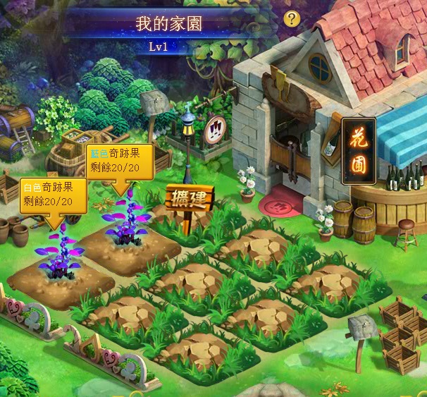 當玩家等級達到31級,就能夠開啟家園系統,在這片屬於自己的小天地裡,玩家可以種植特殊的奇花異草,用以兌換稀有道具;還可以將競技場中的手下敗將拉來為你打工,享受當地主的待遇。一開始進入家園系統只有兩塊一級土地可以耕種,隨著玩家辛勤的打理,土地的數量及等級都會隨之上升,而土地的等級也影響到作物種植出來的品質,在這邊所能種值的作物只有一種,那就是奇蹟果。