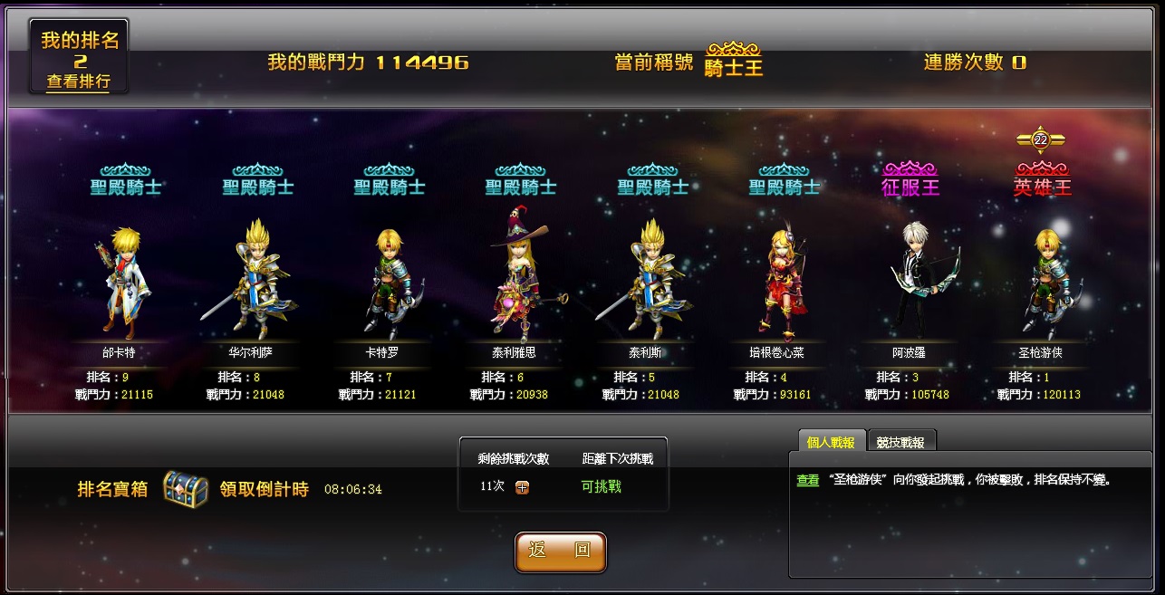 聖杯傳說》中當然也有釋放玩家熱血的競技場系統,玩家只要等級達到一定程度就能開啟。在競技場中玩家可以與全伺服器的菁英玩家們對戰並爭奪排名,系統會依照玩家當前排名來安排可選擇的對手,要是對自己的實力有自信的話,還可以一舉挑戰比自己高五十名的玩家,快速的提升自己的排名。此外根據玩家的戰力、排名和連勝紀錄等等,系統還會給予玩家不同的稱號,想要得到與眾不同的稱號的話,玩家就要在競技場中殺出一條血路才行。