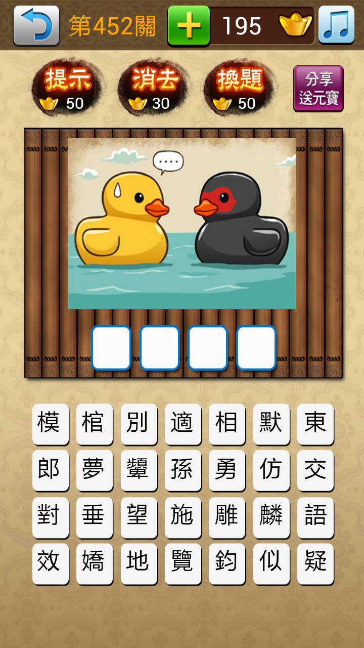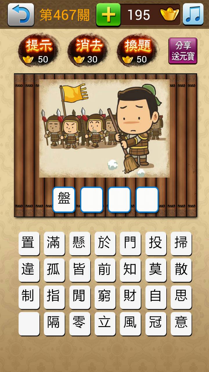 成語大挑戰》遊戲玩法很簡單,每一關都有一張圖片,玩家必須在 28 個亂數文字答案內找到四個字的正解,答對就過關了。遊戲內有提示、刪去、換題三種簡易功能,可以輔助玩家答題,使用功能會消耗些許元寶,元寶只要過關就可以獲得一些。