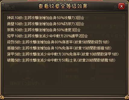 「神武紋章」系統下有神武、鐵壁、禦風、熔甲、殺戮、盾墻、穿甲、破等幾款紋章供主公選擇,分別從攻擊、防禦、速度等方面為主公加力。主公在上戰場前可以從中選擇已開啟的紋章,當發動普攻或技能攻擊時該紋章對應的效果將被觸發,於無形間給敵人有力的一擊。紋章的效果隨著等級的提升而煥發出極大的能量,如此強大的助手,主公,心動了嗎?
