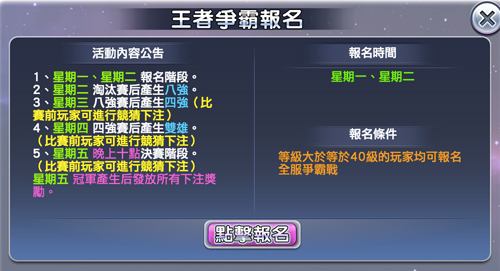 不同於「競技場」的「王者爭霸」是一個大型 PVP 活動