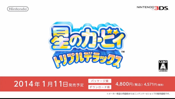 星之卡比 三倍豪華版(星のカービィ トリプルデラックス)》將在 2014 年 1 月 11 日發售等相關情報。包裝版價格與下載版價格同樣是 4800 日圓(含稅)。