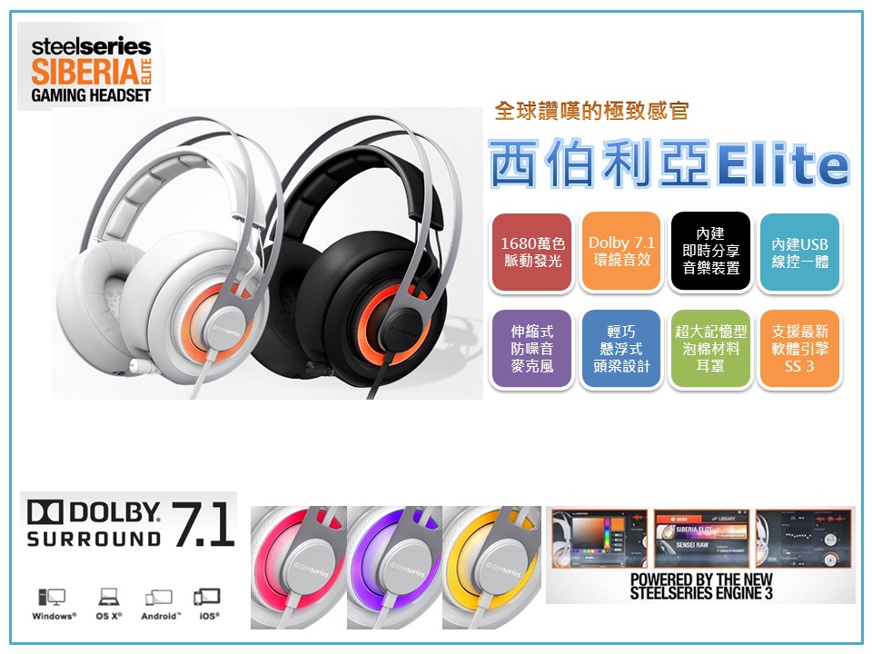 全新一代的西伯利亞 Elite 菁英耳機繼承了其在遊戲音頻設備領域中十年的專業經驗,採用全新 Dolby 技術真實重現虛擬 7.1 環繞立體聲道,讓音質更為純正,而通過 USB 音效卡更能為玩家還原逼真的環繞立體聲音效果。其中最核心的 Dolby Headphone 技術和 Dolby Prologic Iix 技術,不僅可以將一個簡單的立體聲信號轉換為更為豐富的環繞音,還可把多聲道轉換成全 7.1 環繞立體聲信號,造就最極致的音效輸出。更重要的是,它支援強大而簡單易操作的音樂分享功能,能讓使用者將音樂即時分享,創造耳機新體驗!
