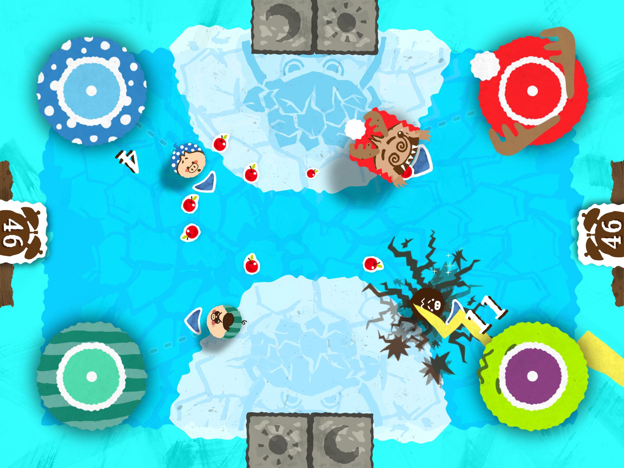 遊戲場景的天氣地型可自由搭配,每一種都有不同的干擾效果。例如:打雷氣候可以將玩家變得黑炭痲痹、沙灘地型會隨機出現陽傘障礙等等,讓每一回合的奪蘋果大賽都充滿新意!