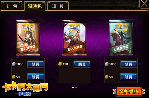 卡卡們大亂鬥》商城卡包,每日第一包價格半價優待!例: 原價 168 金幣的精英包,每日第一包只需要 84 金幣; 所有銀幣開包第一包也享受半價優惠