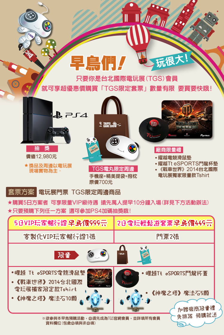為迎接即將到來的電玩展,首度推出官方網站會員獨家享有「TGS 限定套票」早鳥專案,共有兩款分別是「五日 VIP 玩家暢行套票」及「兩日電玩輕鬆遊套票」,五日套票限量 100 組售價 999 元、兩日套票限量 500 組售價 449 元。套票內容包含五日或二日門票、TGS 電丸限定周邊(電丸造型午安枕、手機座和專屬提袋),同時加贈曜越限量款電競滑鼠墊和鬥龍杯墊、《戰車世界》2014 台北國際電玩展獨家限量款 T-Shirt、《神魔之塔》魔法石等廠商限量禮,讓玩家電玩展免排隊,就可搶先帶走限量好禮。其中,購買五日套票的玩家,將可獲得附有個人專屬大頭照的 VIP 暢行證,並享有搶先萬人提前十分鐘入場的優先通關禮遇。凡預購上述任一款套票,皆可再參加 PS4 加碼抽活動,套票數量有限,售完為止。