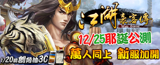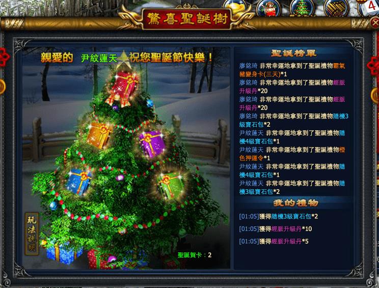 江湖豪客傳陪伴在您的左右與您一起過聖誕。12 月 24 日起玩家可以透過儲值、釣魚、招募武將來獲得聖誕賀卡,使用不同數量的賀卡可以兌換不同的聖誕禮盒,開啟禮盒將有機會可以獲得 4 級寶石、霸氣豬變身卡、經脈丹還有可愛的萌萌貓坐騎等著你帶回家唷!