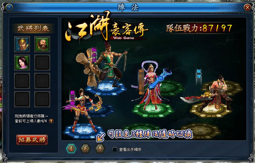 玩家可以一次設定好三種陣法以便隨時切換戰鬥
