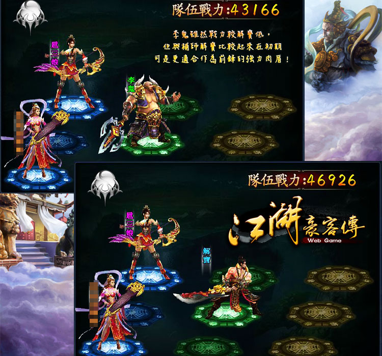 遊戲中一開始玩家可若自身是擁有較強大法術攻擊的將領,大多會選擇物理系的藍色武將「解寶」,再花費十銀兩獲得首儲贈送的紫色武將「扈三娘」,搭配成戰力較高的隊伍!小編在遊戲中發現許多玩家初期都將「解寶」放置於對於前方阻擋敵軍,而自身與弓手則躲在後方,其實仔細觀察一下「解寶」雖然是物理性質,但其所用的大多是策士的「補技」,把它放置前方只是不斷受敵軍攻擊,35 級前除非天命及裝備防禦足夠,否則只是快速地被敵軍擊滅無法發揮作用,相反的選擇將弓手「扈三娘」或將較低階的綠色防禦型免費武將「李鬼」放置於隊伍最前方,雖然整體戰力會低些,但在裝備不足的初期反而能獲得致勝的優勢!
